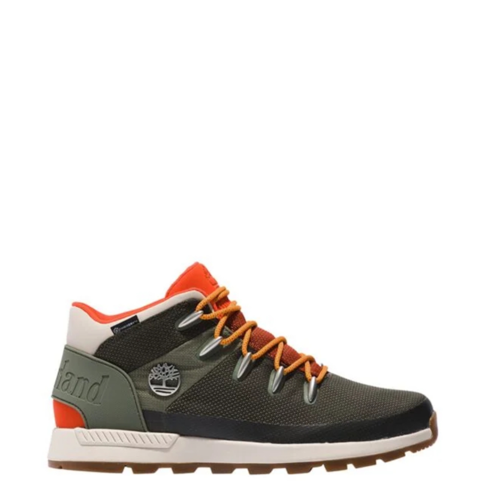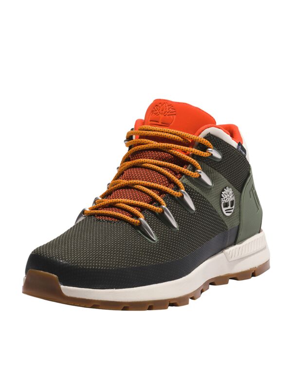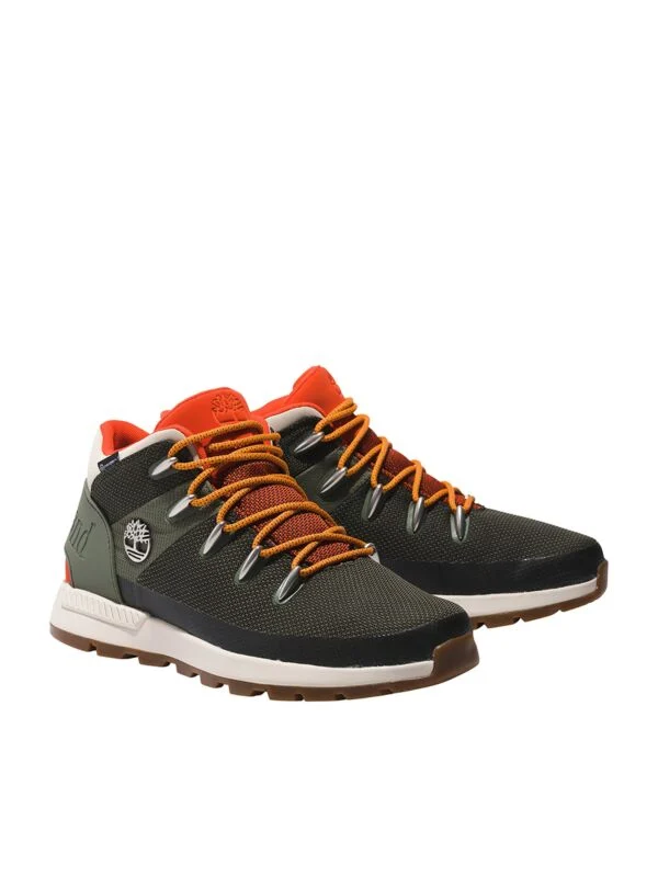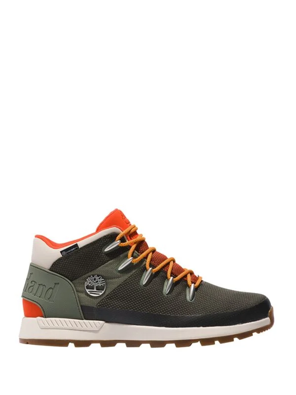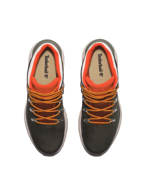 Timberland Sprint Trekker duboke, vodootporne cipele od tekstila. TimberDry tehnologija. Maslinasta boja sa narandžastim detaljima. Logo brenda.